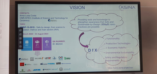 At the event the Project Coordinator Anna Luisa Costa (CNR-ISTEC) showed how to implement the ASINA Safe-and-Sustainable-by-Design management methodology to nano-manufacturing through ASINA industrial case studies and Franco Belosi (CNR-ISAC) illustrated the strategy and results of air monitoring campaign in order to measure the potential release of NPs in one of ASINA industrial settings and assessing the occupational exposure scenarios.